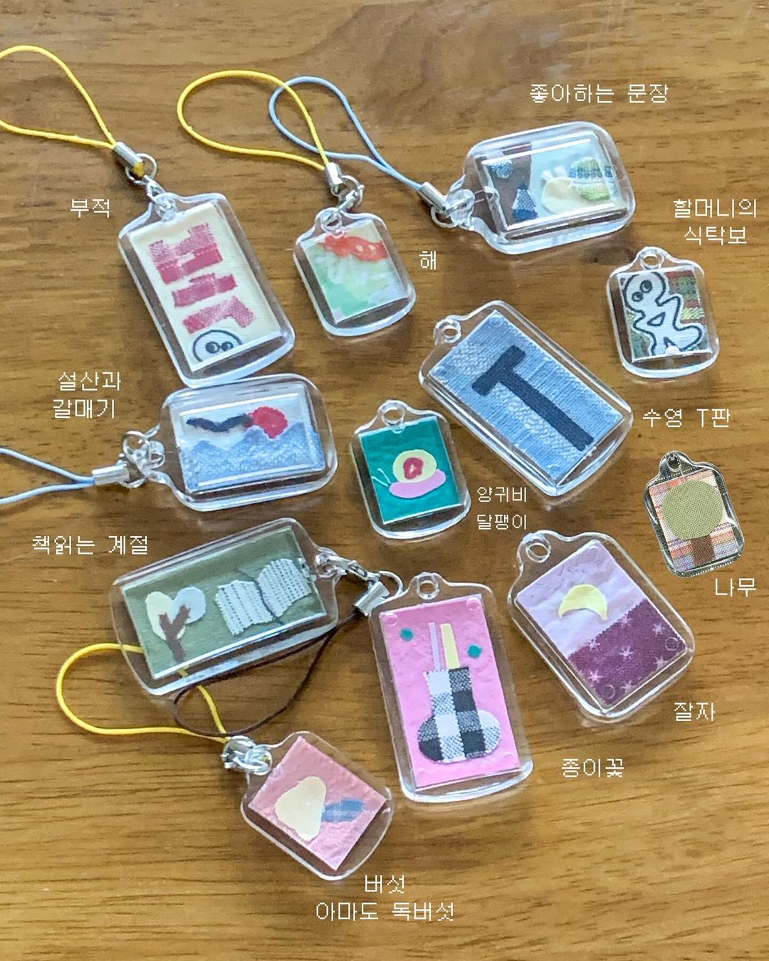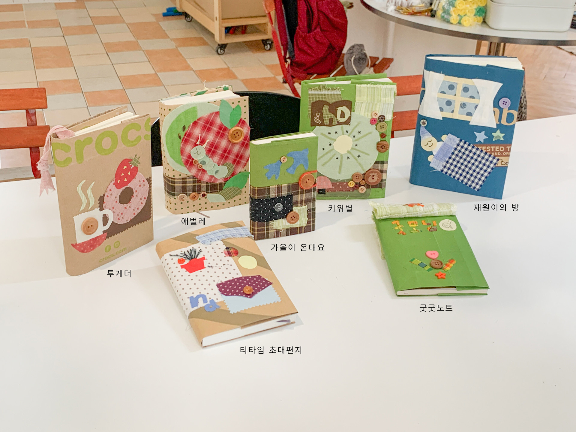 손잡이가 달린 종이가방을 해체하고 책에 덧씌워 원단조각으로 장식했다. 모임원들의 책과 노트에 각자의 색이 잘 담겼다.